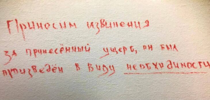 На стене возле малого зала Совета министров красным карандашом было написано: «ПРИНОСИМ ИЗВИНЕНИЯ ЗА ПРИЧИНЁННЫЙ УЩЕРБ, ОН БЫЛ ПРОИЗВЕДЕН ВВИДУ НЕОБХОДИМОСТИ».