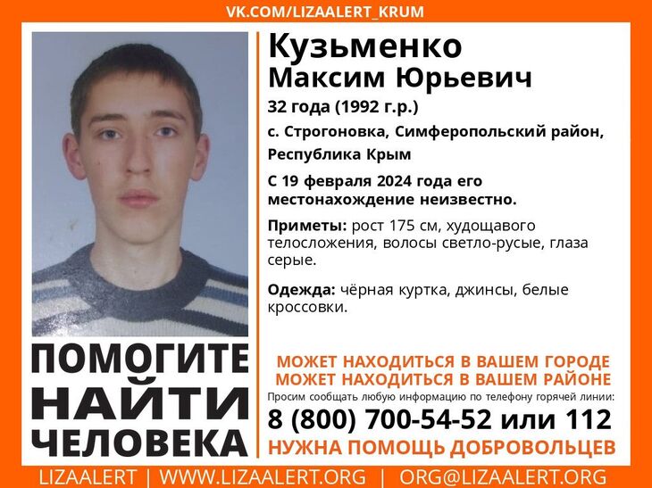 С 19 февраля о местонахождении 32-летнего Максима Кузьменко из села Строгоновка неизвестно. Об этом сообщил поисково-спасательный отряд «ЛизаАлерт».