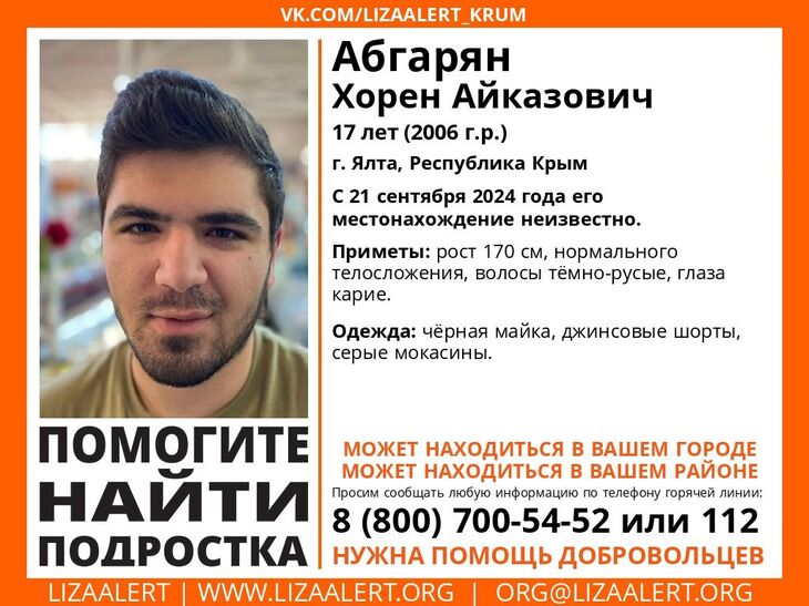 В Ялте ищут 17-летнего Хорена Абгаряна. Подросток после выходных не вернулся домой, с 21 сентября о его местонахождении ничего не известно, сообщает поисково-спасательный отряд «Лиза Алерт» Крым.