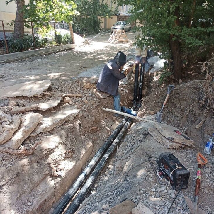 Работы ведутся на пересечении улиц Строителей и Щербака. Процесс осложнён наличием множества коммуникаций, пересекающих в нескольких местах заменяемый участок сетей.