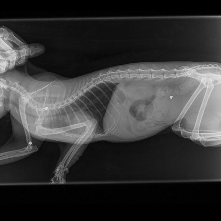 Опубликован рентгеновский снимок, на котором видны следы от пуль. На данный момент кот находится в тяжёлом состоянии, за его жизнь борются ветеринары.