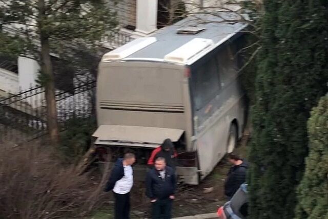В Ялте на улице Леси Украинки, прямо под городской канатной дорогой, в аварию попал автобус. Очевидец разместил фото с места ДТП в соцсети.