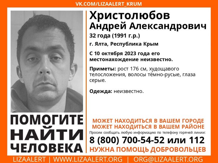 Волонтёры крымского отделения поискового отряда «Лиза Алерт» в Ялте разыскивают 32-летнего Андрея Христолюбова, чьё местонахождение неизвестно с 10 октября этого года.