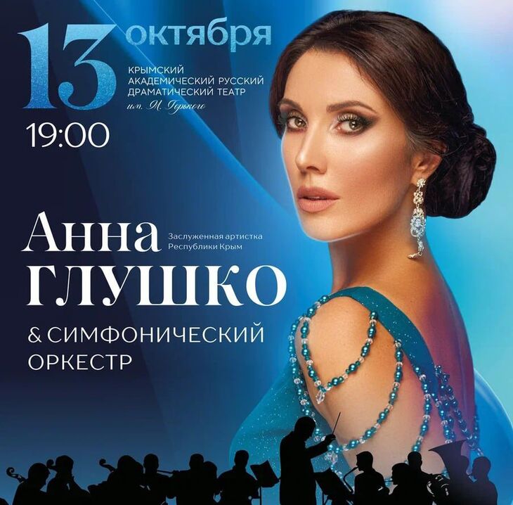 Анна Глушко, обладательница уникального сопрано серебристого тембра, представит на сцене яркие образы оперных и опереточных героинь. В сопровождении Академического симфонического оркестра Крымского концертного объединения под управлением заслуженного артиста Украины и Республики Крым Александра Долинского прозвучат произведения композиторов разных эпох и стран.