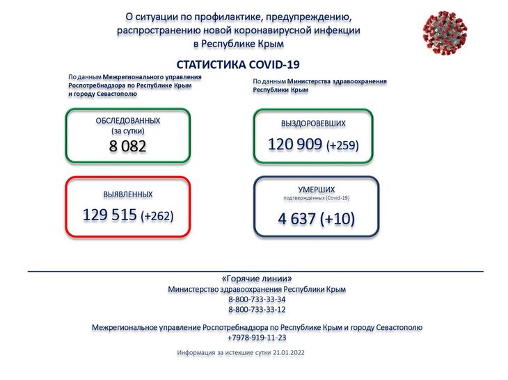 По данным Межрегионального управления Роспотребнадзора по Республике Крым и городу Севастополю за 21 января 2022 года на территории Республики Крым зарегистрировано 262 случая новой коронавирусной инфекции, всего выявлено 129 515 положительных на Covid-19.