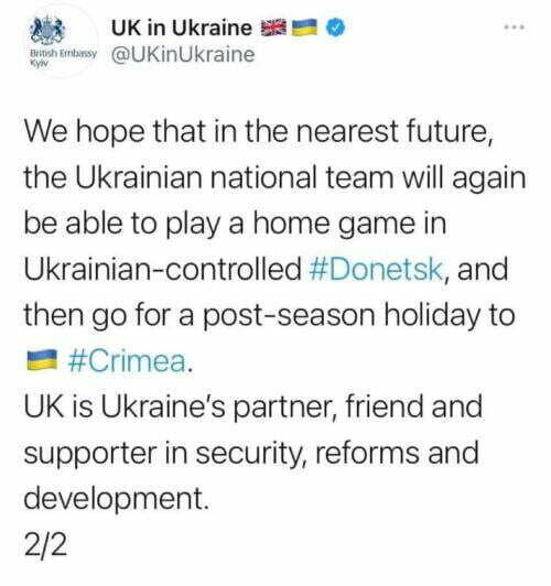 Напомним, британское посольство перед матчем Англия-Украина выразило надежду, что украинская сборная сможет скоро сыграть в Донецке, а потом поедет в отпуск в Крым.