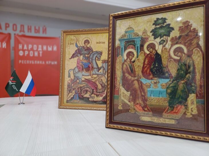 Освященные в Алуштинском храме иконы «Пресвятой Троицы» и «Святого Георгия Победоносца» крымчане передали в рамках проекта «Народный фронт. Всё для победы!». В ближайшее время представители президентского движения вместе с крымскими священнослужителями доставят их в зону СВО в специально оборудованные полевые храмы.