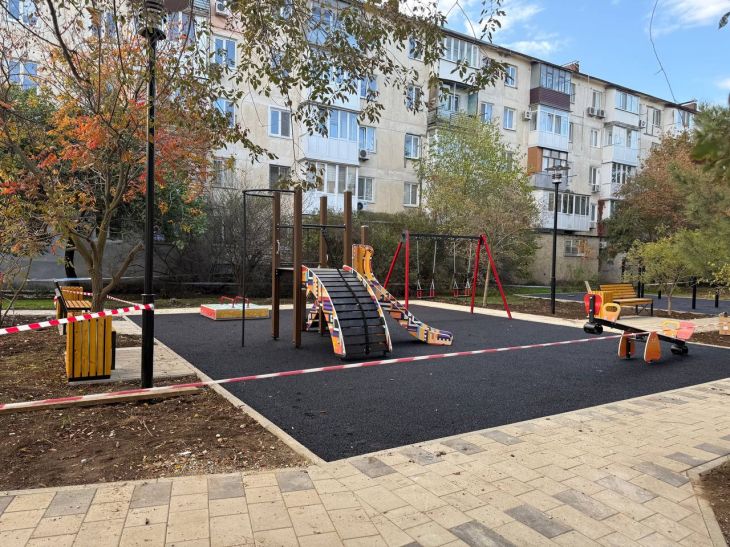 На пр. Победы, 20 в полном объёме выполнено асфальтирование, уложена тротуарная плитка, установлены малые архитектурные формы. "Сего...