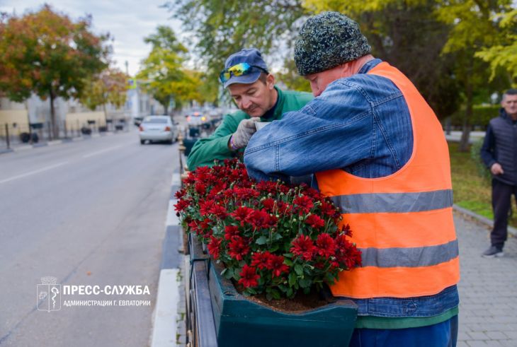 Сотрудники МБУ «Комбинат благоустройства» украшают Евпаторию хризантемами – они хорошо переносят холода и будут радовать жителей и гостей ку...
