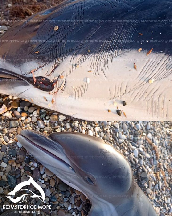 «У детеныша азовки, который выплыл на мелководье живым и вскоре погиб, мы обнаружили тяжёлую травму, нанесённую дельфинами. Были выявлены закрытые переломы двух рёбер с полным отрывом костных обломков и многочисленные кровоизлияния, полученные после сильнейших тупых ударов. На коже также присутствовали свежие следы- «грабли» от зубов белобочек», — уточнили специалисты Центра.