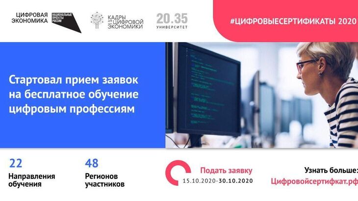 Всего в 2020 году по программе персональных цифровых сертификатов в рамках федерального проекта «Кадры для цифровой экономики» бесплатно обучатся 33 тыс. россиян из 48 регионов страны.