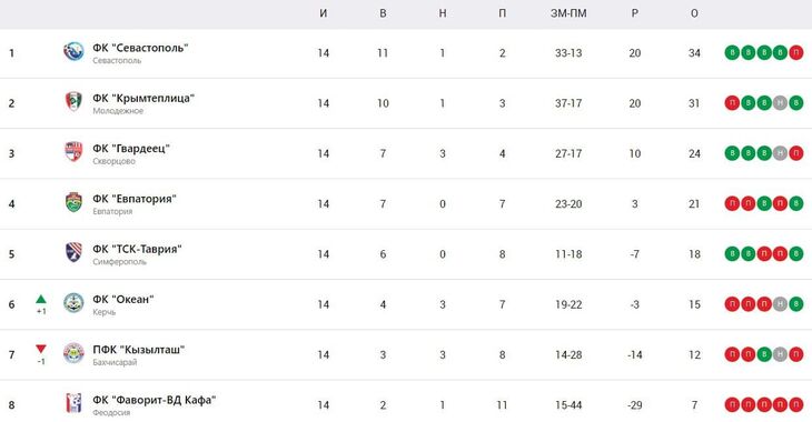 После 14 сыгранных туров таблицу Премьер-лиги Крымского футбольного союза по-прежнему возглавляет «Севастополь». На три очка от «моряков» отстает «Крымтеплица». Тройку лидеров замыкает скворцовский «Гвардеец».