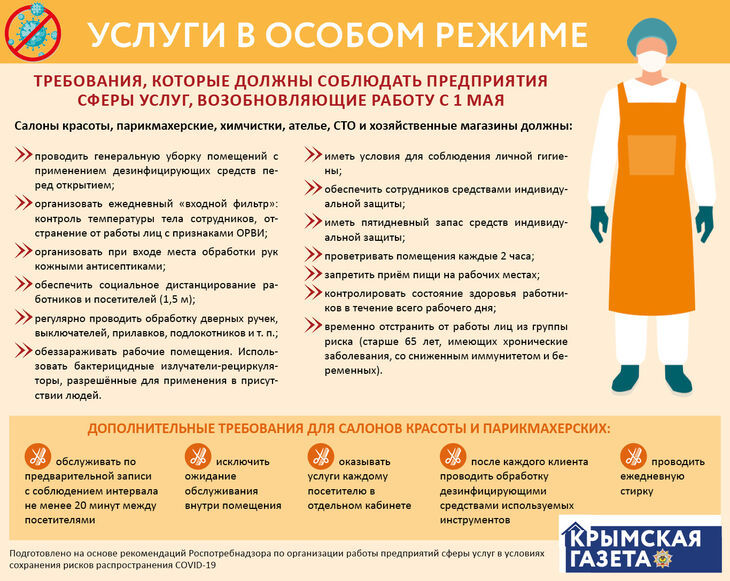12:17, 24 апреля 2020 Какие требования должны соблюдать предприятия сферы услуг с 1 мая Новости МирТесен Новости СМИ2