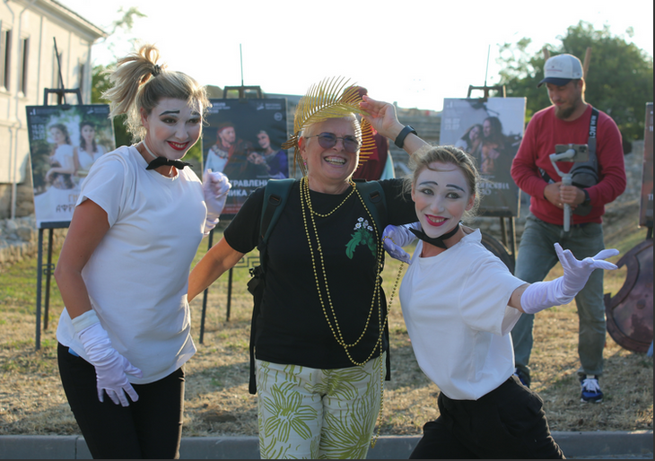 Перед премьерой спектакля в Античном театре гостей встречали мимы, реконструкторы и артисты на ходулях, которые кружили всех в танце и с удовольствием позировали для общих фотографий. А затем зрители познакомились с трагической историей дочери критского царя Федры, к которой обращались великие драматурги древности и современности.