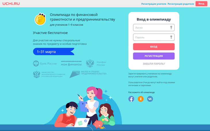 Для участия в олимпиаде ученику нужны логин и пароль – создать их могут учитель или родитель. Для этого нужно открыть сайт Учи.ру, нажать кнопку «Регистрация» или «Зарегистрироваться». Если у школьника уже есть логин и пароль, дополнительно регистрироваться на олимпиаду не нужно — можно сразу переходить к заданиям. На решение заданий дается час. Количество набранных баллов будет известно сразу после завершения олимпиады.