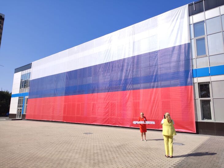 На здании Дворца спорта им. Ю.А. Гагарина в Евпатории разместили Государственный флаг РФ площадью 400 квадратных метров. На его фоне можно с...