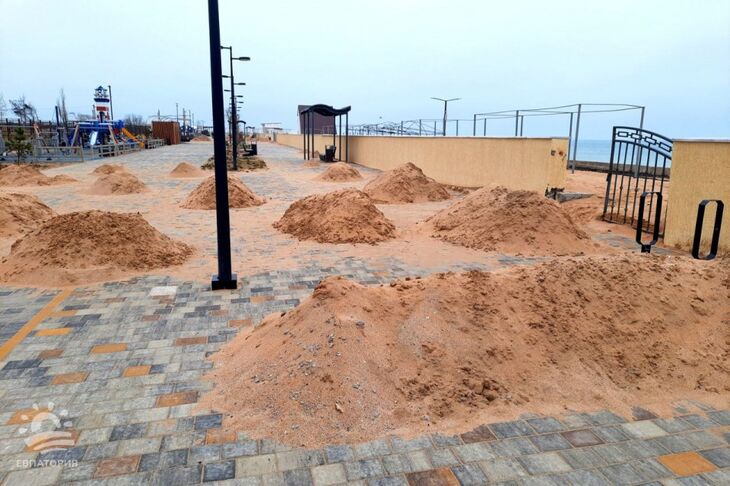 На променадную часть Лазурной набережной в Евпатории вынесло огромное количество песка, разрушились конструкции, размещённые на пляжах. Об этом сообщила глава городской администрации Елена Демидова.