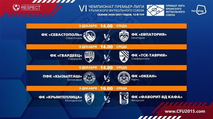 На этой неделе команды Премьер-лиги КФС проведут сразу по два матча. Игры 12 тура пройдут 9 декабря. В центральном поединке встретятся «Севастополь» и «Евпатория». Также будет интересно посмотреть на то, как «ТСК-Таврия» сыграет со скворцовским «Гвардейцем». «Кызылташ» и «Океан» выяснят, кто из них займет комфортное место в середине турнирной таблице. «Крымтеплица» должна без проблем добиваться победы в Феодосии.