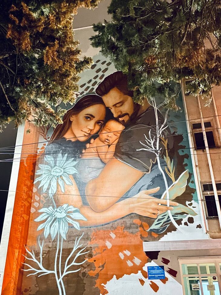 В Ялте на фасаде детской поликлиники появился мурал с изображением молодой семьи.