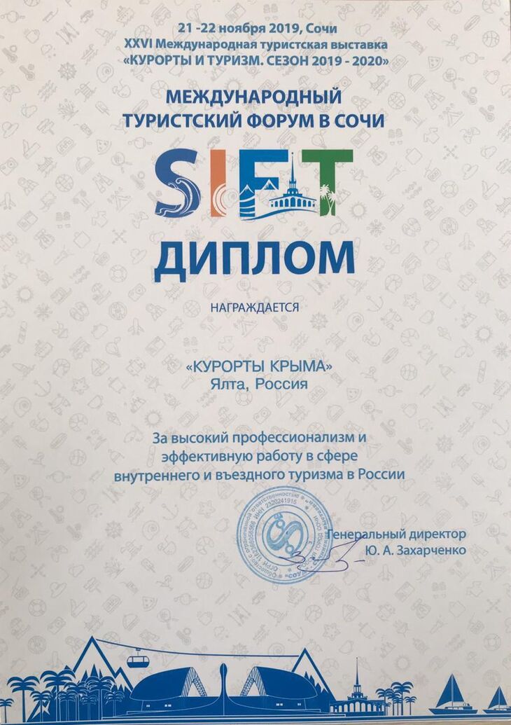 Санатории сети «Курорты Крыма» приняли участие в VI Международном туристском форуме SIFT, который проходил в Сочи 21 и 22 ноября. Сеть получила награду «За высокий профессионализм и эффективную работу в сфере внутреннего и въездного туризма». Ежегодно этот форум собирает большое количество ключевых игроков туристского бизнеса из России и зарубежья.