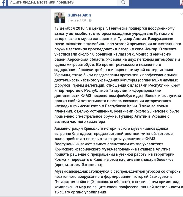 «Эти группы действовали под давлением главы Меджлиса крымскотатарского народа Рефата Чубарова, который неоднократно высказывался о деятельности Альтина. Наши источники в Киеве подтвердили эту информацию и поэтому мы сегодня решили это обнародовать», — пояснил причину позднего появления сообщения о похищении учредителя крымского музея Заур Смирнов.