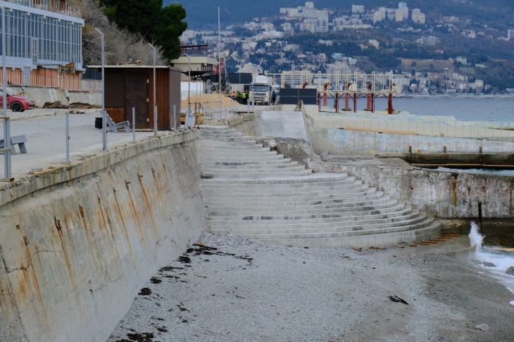 На пляже «Дельфин» в активной стадии восстановительные работы после шторма века. Буны укрепляют, обрабатывают специальным гидрофобным состав...
