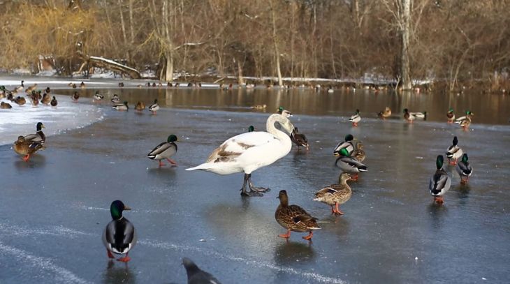 Зимой сотрудники парка Гагарина внимательно следят за птицами на пруду. Уток и лебедей подкармливают два раза в день специализиро...