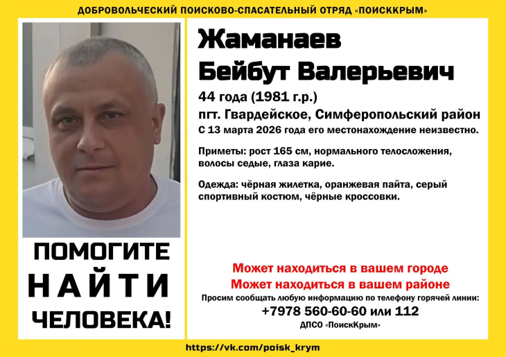 В посёлке Гвардейское Симферопольского района 13 марта пропал 44-летний Жаманаев Бейбут Валерьевич. Об этом сообщили в поисковом отряде «...