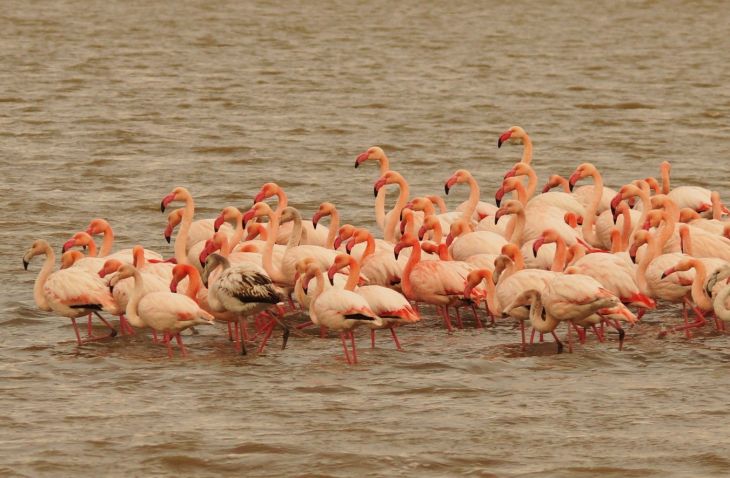 Сегодня утром стаю из примерно 150 взрослых фламинго и 12 молодых заметили на озере Аджиголь под Феодосией. Ранее стаю с приблизительно т...