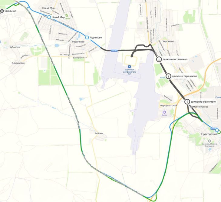 Рейс по маршруту на 20:30 из Симферополя будет осуществляться по схеме объезда. В прямом направлении через: шоссе «Симферополь-Евпатория-Мирный»➝Ново-Евпаторийская развязка➝Аэропортовская развязка➝Евпаторийское шоссе.