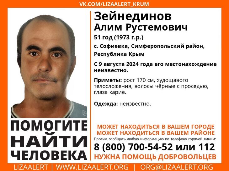В Крыму в районе села Софиевка (Симферопольский район) вышел из дома и не вернулся Алим Зейнединов. Поиски мужчины ведутся с 9 августа. Об этом сообщил поисково-спасательный отряд «Лиза Алерт» Крым.