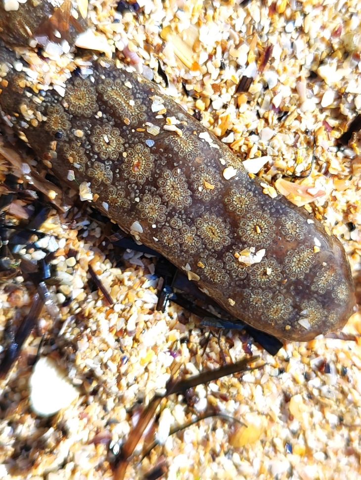 Как сообщают специалисты, это может быть колониальная оболочковидная асцидия, также известная как звёздчатая оболочка, звёздчатая асцидия или золотистая звёздчатая оболочка. Она крепится на водоросли, по ощущениям упругая, если прикоснуться, то может слегка сокращаться и при контакте возникает ощущение "покусывания".