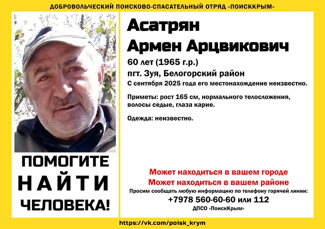 В Белогорском районе пропал 60-летний житель Зуи Армен Аматрян. Об этом сообщили волонтеры отряда "ПоискКрым". С сентября 2025 года его...