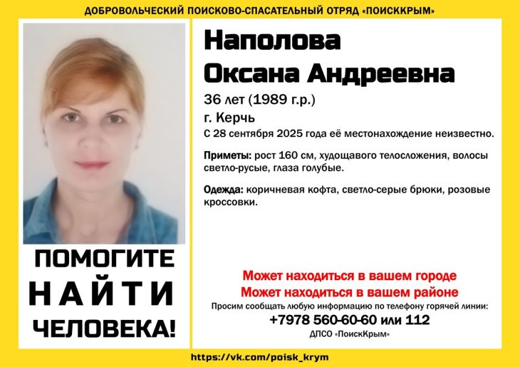 В Керчи со вчерашнего дня разыскивают 36 летнюю Наполову Оксану Андреевну. "С 28 сентября 2025 года её местонахождение н...