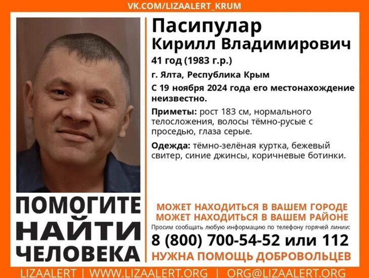 Волонтеры отряда «ЛизаАлерт» ищут пропавшего жителя курортной Ялты. Пасипулар Кирилл Владимирович 41 год (1983 г...