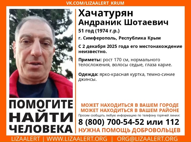 В крымской столице ведутся поиски 51-летнего Андраника Хачатуряна. Мужчина пропал 2 декабря, пока поиски результатов не дали. Об этом сообщи...