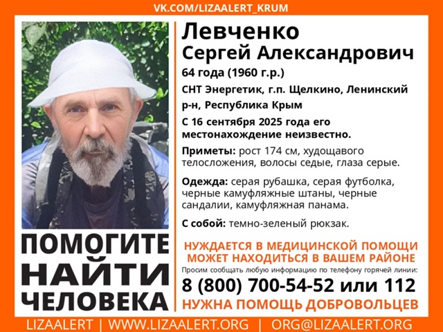 Вчера в дачном товариществе Энергетик под Щелкино пропал человек. «Пропал Левченко Сергей Александрович, 64 года, СНТ Энергетик, ...
