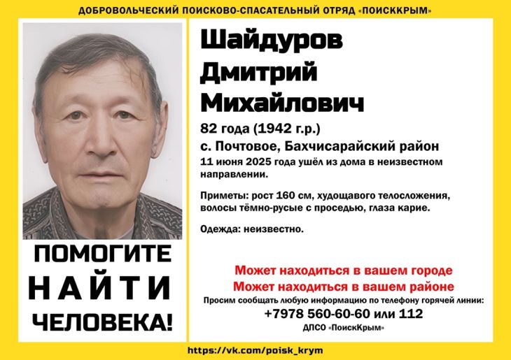 В Бахчисарайском районе пропал 82-летний мужчина. Об этом сообщили волонтеры отряда «ПоискКрым». «Пропал Шайдуров Дмитрий Михайлович, 8...