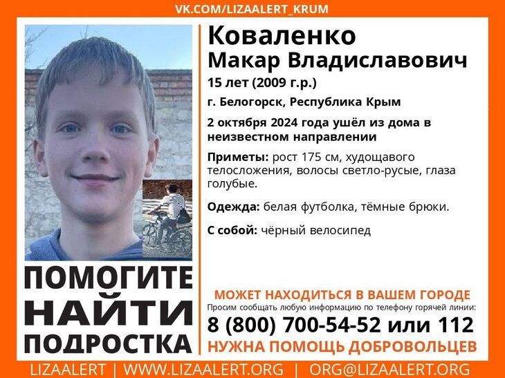 В Белогорске пропал Макар Коваленко. Поиски подростка ведутся со вчерашнего дня, с собой у парня был чёрный велосипед, сообщает поисково-спа...