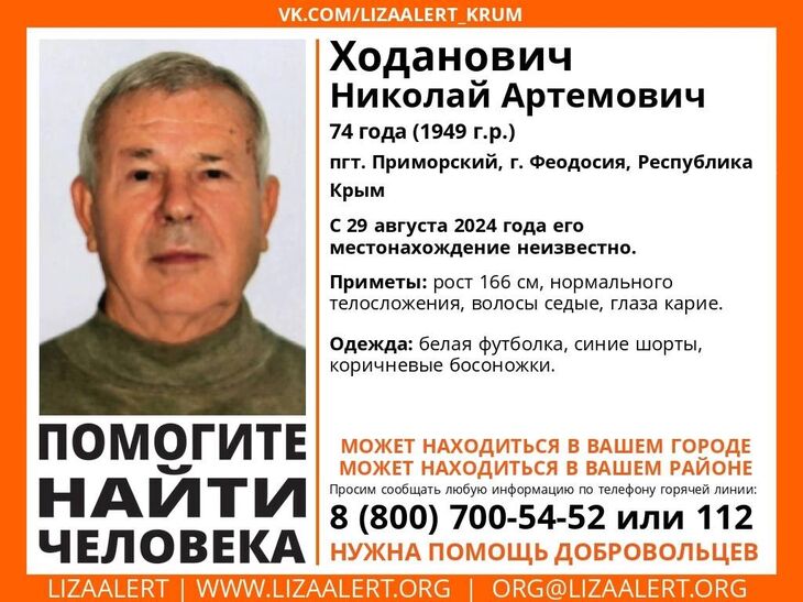 29 августа ушел из дома и не вернулся Николай Ходанович из поселка Приморское, городского округа Феодосии. Об этом сообщили в поисково-спаса...