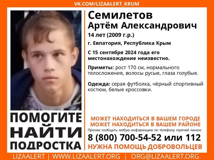 В Крыму вторые сутки ведутся поиски четырнадцатилетнего Артёма Семилетова. О местонахождении мальчика с 15 сентября ничего неизвестно. Об эт...