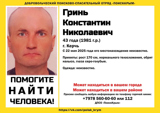 В Керчи волонтеры разыскивают 43-летнего местного жителя Константина Гринь. С 22 мая 2025 года его местонахождение неизвестно. Его прим...