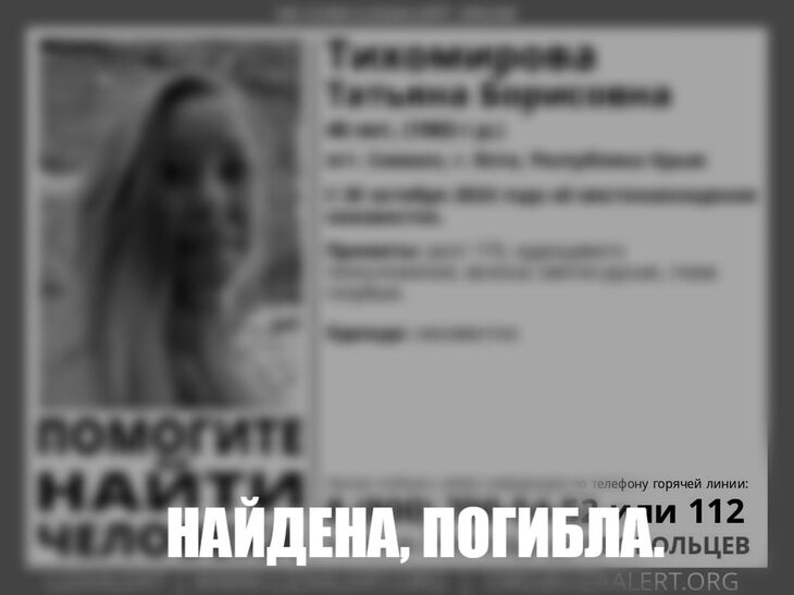 С 20 октября о местонахождении Татьяны Тихомировой из поселка Симеиз Большой Ялты было неизвестно. Об этом сообщили в поисково-спасательном отряде «ЛизаАлерт».