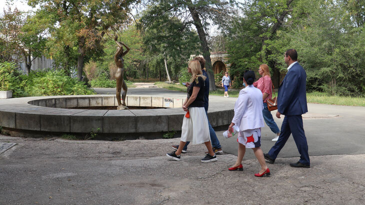 Особое внимание на совещании было уделено сакскому курортному парку. О том, что он из себя представляет, рассказала начальник отдела архитектуры администрации Валерия Попова, которая подробно проинформировала приезжих экспертов о структуре парка, его территории и расположенных там объектах. А после этого по желанию гостей была организована экскурсия по парку, во время которой они могли на месте оценить текущее состояние и масштабы предстоящей работы по реанимации этого знакового для города объекта.