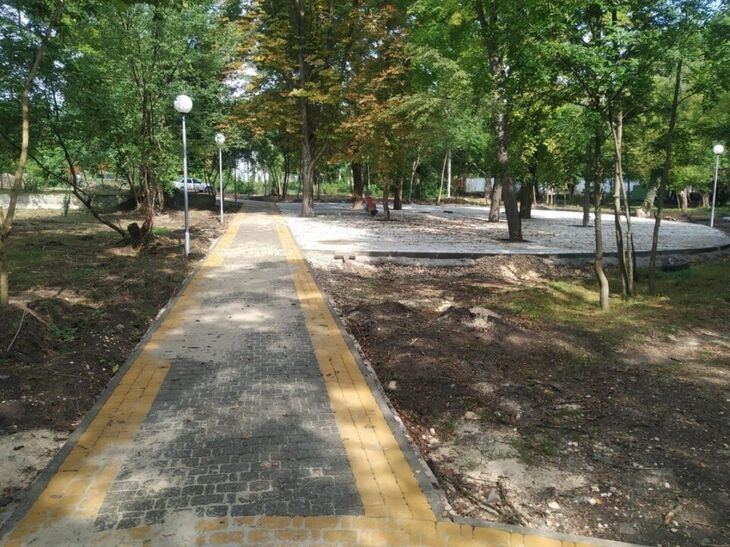 Рабочие выложили тротуары плиткой, установили бордюрный камень. Залито бетонное основание под детскую площадку, проложены коммуникации и установлены опоры освещения.
