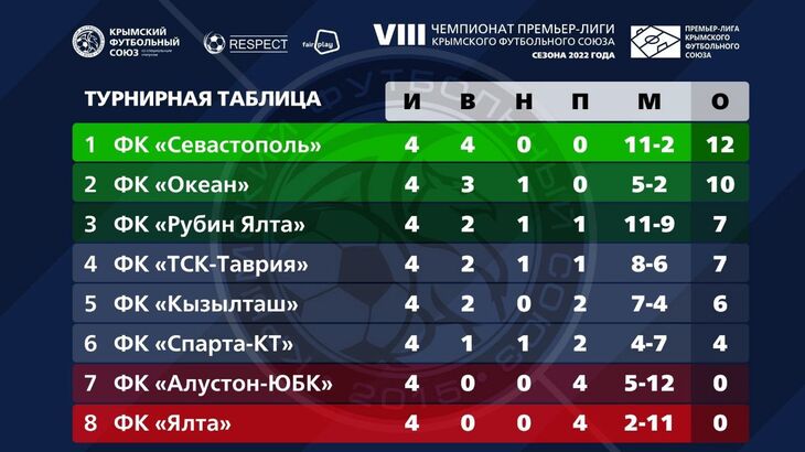 Турнирную таблицу после четырех туров единолично возглавляет «Севастополь». На втором месте достаточно неожиданно идет керченский «Океан». «Алустон-ЮБК» и «Ялта» пока не имеют набранных очков.