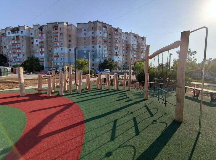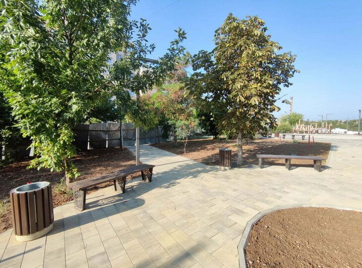 Завершены работы по укладке тротуарной плитки, установлены скамейки и урны, для детей разных возрастных категорий размещены современные игровые площадки со специальным напольным покрытием, создана система искусственного полива. Работа по озеленению завершится после снижения аномально высокой температуры.