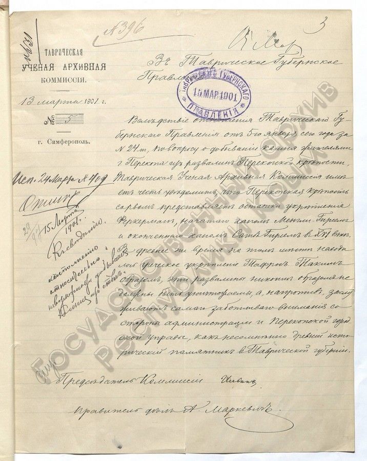 3. Уведомление ТУАК о добывании камня жителями г. Перекопа из развалин Перекопской крепости (1901 г.)