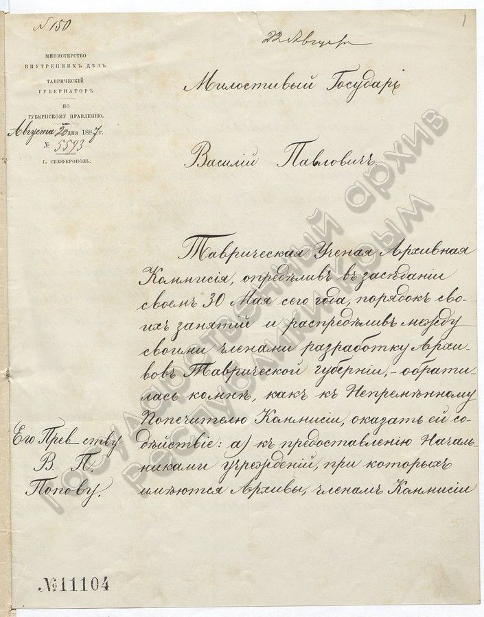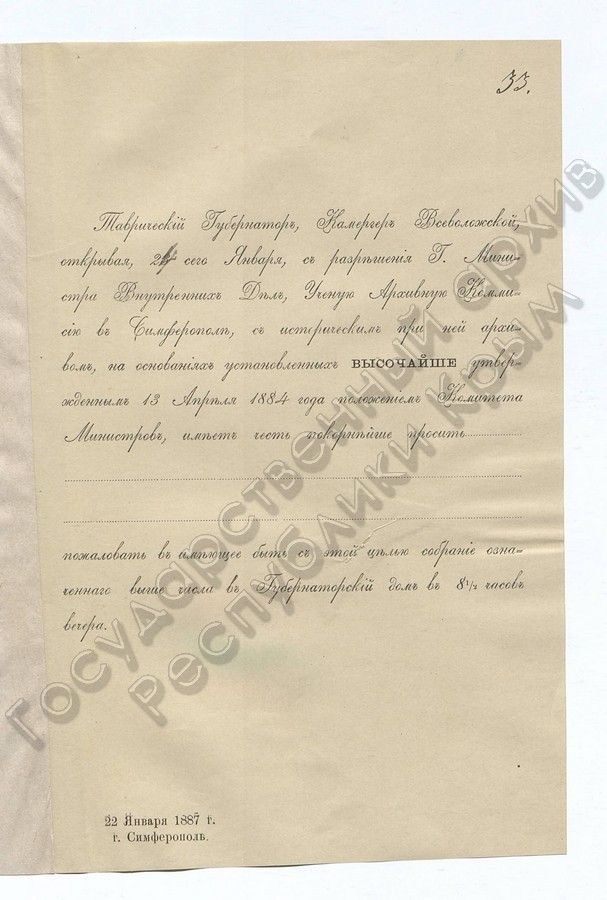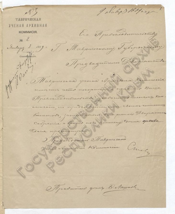 1. О приглашении Таврического Губернского Предводителя Дворянства по оказанию возможного содействия Таврической ученой Архивной Комиссии (1887 г.)