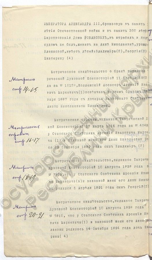 11. Родословная с изложением документов о дворянстве рода Маркевичей (1916 г.)